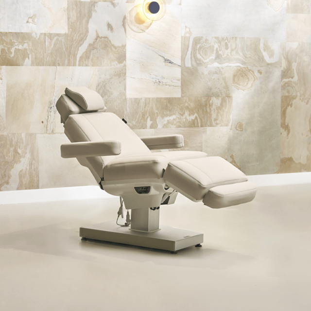 De aluminium voet maakt het mogelijk om verticaal omhoog en omlaag te gaan, hierdoor neemt de behandelstoel minder ruimte in dan vergelijkbare behandelstoelen met een hefboomsysteem. De behandelstoel is uitermate geschikt voor schoonheid- pedicure en lichaamsbehandelingen.